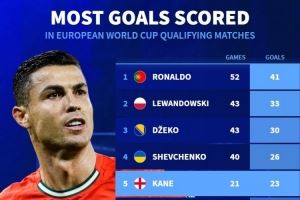 欧洲世预赛历史射手榜:C罗52场41球居首,哈兰德14场21球第7
